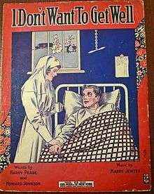 "I Don't Want to Get Well" is a World War I era song released sometime between 1917 and 1918. Harry Pease and Howard Johnson wrote the lyrics. Harold Jentes composed the music.[1] Leo Feist, Inc. of New York, New York published the song. Rosenbaum Studios designed the sheet music cover. It features a Red Cross nurse checking the pulse of a wounded soldier as he lies in his hospital bed. The two look at each other longingly. A battle is seen through the window.[2] It was written for both voice and piano.[3][4]