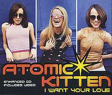 "I Want Your Love" is a song by Atomic Kitten, released as the third single from their debut album Right Now. The single peaked at number 10 on the UK Singles Chart,[1] and also reached number 48 in Ireland. The song heavily samples the theme to the 1958 film The Big Country. Almost exactly a decade earlier, the same sample had been used on the song "The Only Rhyme That Bites" by MC Tunes vs 808 State, which also peaked at number 10 on the UK Singles Chart. Initial copies of "I Want Your Love" contained a sample of the KLF's 1991 hit single "Justified and Ancient"; later copies had the sample removed. The video & radio versions contained vocals from Kerry Katona; these vocals were replaced on the album version by Jenny Frost. The song was produced, arranged, recorded and mixed by Damien Mendis at Metropolis Studios, London. "I Want Your Love" is also featured on the Greatest Hits album.