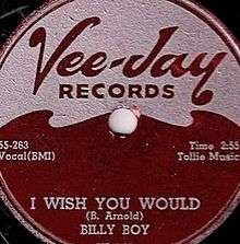 "I Wish You Would" is a song recorded by Chicago blues musician Billy Boy Arnold in 1955. It was developed while Arnold was performing with Bo Diddley and incorporates a Diddley-style rhythm.[2] Called "a timeless Chicago blues classic",[3] "I Wish You Would" is Arnold's best-known song and has been recorded by several artists, including the Yardbirds, who recorded it for their debut single in 1964.