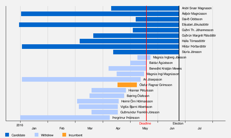 - Ólafur Ragnar Grímsson – Incumbent President. In January, he declared that he would not seek reelection,[6] but decided to enter the race on 18 April after political unrest in connection with the Panama Papers leak.[8] He subsequently withdrew on 9 May stating as his reason that other qualified candidates had now entered the race.[49]