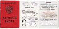 Identity card of the Russian Armed Forces (Russian: Военный билет Вооружённых сил России) is a document issued to soldiers of the Armed Forces of the Russian Federation and other "power" agencies, where military service is provided, as well as to those who are exempt from military service or upon admission to the reserve. For citizens on the conscription military service, this is a document replacing the passport of a citizen of the Russian Federation.[1] In modern Russian military, the ID cards of two different types are issued: ID for a soldier/sailor/sergeant/warrant officer, and ID for a military officer.