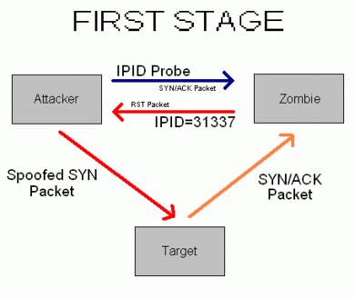 1. Attacker to target -> SYN, target to zombie ->SYN/ACK, Zombie to target -> RST (IPID increment by 1)