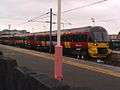 The line was electrified at 25 kV AC in 1995, and was initially worked by three car Class 308 EMUs. The previous latticework footbridge - constructed by Andrew Handyside and Co. in 1909 - was demolished during electrification works and replaced with the present structure which has solid sides to protect pedestrians from the overhead wires.