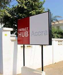 Impact Hub Accra is a co-working space located in Accra, Ghana.[1][2] The hub recently joined the Impact Hub (Global Network) through the Africa Seed Program.[3][4] Impact Hub Accra main mission is to support inclusive growth in Ghana through the creation of a social innovation ecosystem by developing programs, providing workspace, access to capital and connecting entrepreneurs focused on solutions to regional challenges. Impact Hub Accra is seeking to build a globally integrated entrepreneurial community that promotes high impact developments in West Africa.[5][6]