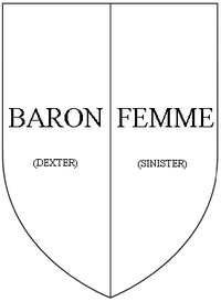 The husband's arms are shown in the dexter half (on the right hand of someone standing behind the shield, to the viewer's left), being the place of honour, with the wife's paternal arms in the sinister half. For this purpose alone the two halves of the impaled shield are called baron and femme, from ancient Norman-French usage.[1] Impalement is not used when the wife is an heraldic heiress, that is to say when she has no brothers to carry on bearing her father's arms, in which case her paternal arms are displayed on an escutcheon of pretence in the centre of her husband's arms, denoting that the husband is a pretender to the paternal arms of his wife, and that they will devolve upon the couple's heir(s) as quarterings. When a husband has been married more than once, the sinister half of femme is split per fess, that is to say horizontally in half, with the paternal arms of the first wife shown in chief and those of the second wife in base. The sinister side may thus be divided more than twice in similar fashion where required.