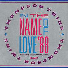 "In The Name Of Love '88" is a 1988 single by Thompson Twins from the album The Best of Thompson Twins: Greatest Mixes. The song originally featured on the 1982 albums Set, and In The Name Of Love, and was written by the early seven piece lineup of the band: Tom Bailey, Alannah Currie, Joe Leeway, John Roog, Chris Bell, Peter Dodd, and Matthew Seligman. The song was newly remixed by Shep Pettibone for the Greatest Mixes album. The single peaked at #46 in the UK, spending 3 weeks on the chart.[3] The single fared better in America, where it peaked at #1 on the US Billboard Dance/Club Play chart.[4]