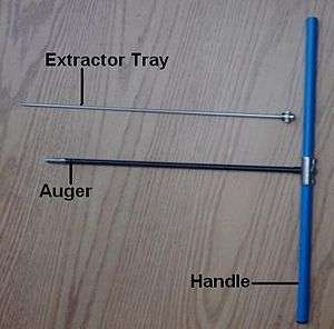 An increment borer is a specialized tool used to extract a section of wood tissue from a living tree with relatively minor injury to the plant itself.[1] The tool consists of a handle, an auger bit and a small, half circular metal tray ( the core extractor) that fits into the auger bit; the last is usually manufactured from carbide steel. It is most often used by foresters, researchers and scientists to determine the age of a tree - the relative science being called dendrochronology - The operation enables the user to count the rings in the core sample, to reveal the age of the tree being examined and its growth rate. After use the tool breaks down: auger bit and extractor fit within the handle, making it highly compact and easy to carry.