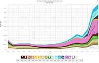 Bilateral trade between both countries is concentrated in key value chain sectors. These sectors include highly diversified segments such as machinery, electronics, aerospace, automobile, commercial shipping, chemicals, pharmaceuticals, fertilisers, apparels, precious stones, industrial metals, petroleum products, coal, high-end tea and coffee products.[34] Bilateral trade in 2002 stood at $1.5 billion[35] and increased by over 7 times to $11 billion in 2012[36] and with both governments setting a bilateral trade target of $30 billion by 2025.[3][4][34] Bilaterial bodies that conduct economic relations between the two countries include IRIGC, the Indo-Russian Forum on Trade and Investment, the India-Russia Business Council, the India-Russia Trade, Investment and Technology Promotion Council, the India-Russia CEOs' Council and the India-Russia Chamber of Commerce.[34][37]