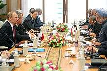 The first major political initiative, since the collapse of the Soviet Union, between India and Russia began with the Strategic Partnership signed between the two countries in 2000. President Vladimir Putin stated in an article written by him in the Hindu, "The Declaration on Strategic Partnership between India and Russia signed in October 2000 became a truly historic step".[19][20] Former Prime Minister Manmohan Singh also agreed with his counterpart by stated in speech given during President Putin's 2012 visit to India, "President Putin is a valued friend of India and the original architect of the India-Russia strategic partnership".[21] Both countries closely collaborate on matters of shared national interest these include at the UN, BRICS, G20 and SCO where India has observer status and has been asked by Russia to become a full member.[9] Russia also strongly supports India receiving a permanent seat on the United Nations Security Council.[10] In addition, Russia has vocally backed India joining the NSG[22] and APEC.[23] Moreover, it has also expressed interest in joining SAARC with observer status in which India is a founding member.[12][24]