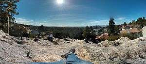 The top of the main outcropping, Indian Rock, commands a spectacular view that encompasses sights from downtown Oakland and the University of California, Berkeley campus to the south; central Berkeley, San Francisco Bay, and San Francisco to the west; and Marin County and Richmond, California to the northwest and north. All three of the bay's largest bridges can be seen from the rock. Volcanic in origin, Indian Rock is the largest of a number of similar rhyolite rock formations in the vicinity, including the smaller rocks in the portion of the park on the east side of Indian Rock Ave. For example, only one block farther up the east side of Indian Rock Ave. is the 0.39-acre (1,600 m2) Mortar Rock Park, which has its own complex of granite outcroppings. Many remains of acorn-grinding pits carved into solid rock can be found in all these outcroppings, especially the aptly named Mortar Rock. These pits were made by the local indigenous people, the Huichin band of the Ohlones.