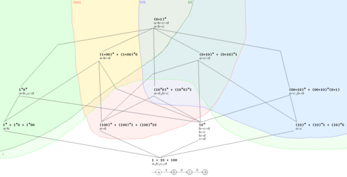 Dupont et al. have shown that the set of all structurally complete finite automata[note 1] generating a given input set of example strings forms a lattice, with the trivial undergeneralized and the trivial overgeneralized automaton as bottom and top element, respectively. Each member of this lattice can be obtained by factoring the undergeneralized automaton by an appropriate congruence relation. The image shows an example for the above input string set { 1, 10, 100 }. Each automaton is denoted by an equivalent regular expression. For the trivial undergeneralization at the bottom node, also the automaton form is sketched in grey, consisting of states a, b, c, and d. Each node's automaton is the result of factoring the bottom automaton by the congruence relation shown in grey below the node.