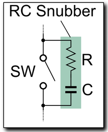 A simple RC snubber uses a small resistor (R) in series with a small capacitor (C).[1] This combination can be used to suppress the rapid rise in voltage across a thyristor, preventing the erroneous turn-on of the thyristor; it does this by limiting the rate of rise in voltage (dV/dt) across the thyristor to a value which will not trigger it. An appropriately-designed RC snubber can be used with either DC or AC loads. This sort of snubber is commonly used with inductive loads such as electric motors. The voltage across a capacitor cannot change instantaneously, so a decreasing transient current will flow through it for a small fraction of a second, allowing the voltage across the switch to increase more slowly when the switch is opened. Determination of voltage rating can be difficult owing to the nature of transient waveforms, and may be defined simply by the power rating of the snubber components and the application. RC snubbers can be made discretely and are also built as a single component (see also Boucherot cell).