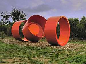 This work was installed in 1980, on a small lawn outside the Union Building at the heart of the University of Melbourne.[47] It is formed from 19mm steel, and consists of two upright steel circles, each 360 cm in diameter, and three folded metal planes; the total length is 6 metres.[48] It provides the students with a unique resting place among its massive unfurling bands and is the focal point of one of the university's busiest outdoor spaces, the Union Lawn.[49] see more images