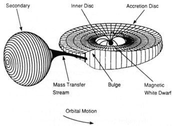 An Intermediate Polar (also DQ Herculis Star) is a type of cataclysmic variable binary star system. In most cataclysmic variables, matter from a main-sequence companion star is gravitationally stripped by a white dwarf star in the form of an accretion disk. In intermediate polar systems, the accretion disk is disrupted by the magnetic field of its white dwarf star. Infalling gas from the companion star will form a disk when the matter is still far from the white dwarf, but will follow magnetic field lines in accretion streams when the matter falls closer to the white dwarf. In the transition region between the accretion disk and the accretion stream, infalling gas may also fall as curved sheets called accretion curtains.
