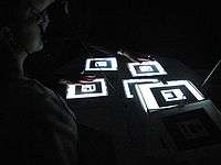 HAL 9000 An interactive installation in which four different atmospheres are created by certain images and sounds that inhabit it. This proposal works with a technology called Augmented Reality which is a representation model for the handling, integration and interaction of images, which merges the everyday reality with virtual reality. By allowing interaction markers and total control of the projections and sounds by those who are there.[2]