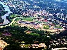 Aerial view of downtown Schenectady, looking east, with I-890 running across the city from center left to center right