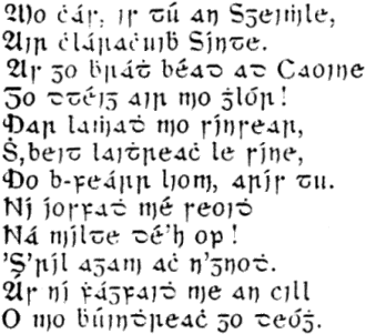 The literary Classical Irish which survived till the 17th century was already archaic and its spelling reflected that; Theobald Stapleton's 1639 catechism was a first attempt at simplification.[6] The classical spelling represented a dialect continuum including distinctions lost in all surviving dialects by the Gaelic revival of the late 19th century. The issue of simplifying spelling, linked to the use of Roman or Gaelic type, was controversial in the early decades of the 20th century.[7] The Irish Texts Society's 1904 Irish–English bilingual dictionary by Patrick S. Dinneen used traditional spellings.[7] After the creation of the Irish Free State in 1922, all Acts of the Oireachtas were translated into Irish, initially using Dinneen's spellings, with a list of simplifications accruing over the years.[7] When Éamon de Valera became President of the Executive Council after the 1932 election, policy reverted to older spellings, which were used in the enrolled text of the 1937 Constitution.[7] In 1941, de Valera decided to publish a "popular edition" of the Constitution with simplified spelling and established a committee of experts, which failed to agree on recommendations.[7][8] Instead, the Oireachtas' own translation service prepared a booklet, Litriú na Gaeilge: Lámhleabhar an Chaighdeáin Oifigiúil, published in 1945.[8] The following are some old spellings criticised by T. F. O'Rahilly and their simplifications:[7]