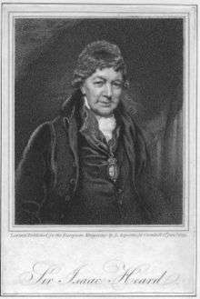 Sir Isaac Heard (10 December 1730 – 29 April 1822) was a long-serving officer of arms at the College of Arms in London. He began his heraldic career as Bluemantle Pursuivant of Arms in Ordinary. He would go on to hold the posts of Lancaster Herald of Arms in Ordinary, Norroy King of Arms and Brunswick King of Arms. In 1784, he was appointed Garter Principal King of Arms. It was in this capacity that he helped to plan the funeral of Horatio Nelson, 1st Viscount Nelson. Heard continued as Garter until his death in 1822 at the age of 91.