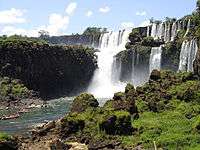 The Isla de San Martín (English: Island of San Martín) is an island located in Argentina's Iguazu River, within the Iguazu Falls[1] in Misiones Province. The island spans the 3 levels that form the falls, but only the lower and middle levels are open to visitors. The island can only be reached in small boats, unless the river is below the minimum level. Once on the island, one must climb 190 steps through three different pathways that lead to a balcony with panoramic views.