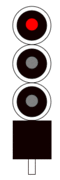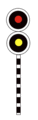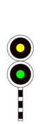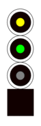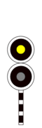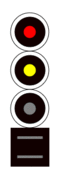 Line clear. Proceed at 30 km/h and prepare to stop. | Line blocked and abnormally close (less than 600/900m but not less than 350m) or track is somehow obstructed. In the latter case, the next signal will show the aspect "red and double yellow."
