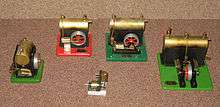 The steam engine range consisted of four stationary engines, and a steam engine unit for model boats. The stationary engines were the Minor, Junior, Standard and Major.[4] The major could also be bought complete with a set of miniature workshop tools. When the steam engine line was brought to an end in 1965, remaining stocks of the model boat engine were bought up by Mamod and used for their ME3 "marine engine".
