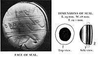 The name Jaazaniah appears on a sixth-century BC onyx seal discovered during the excavation of the Tell en-Nasbeh site, likely the biblical city of Mizpah in Benjamin, near Jerusalem,[4] conducted between 1926 and 1935 by William Frederic Badè of the Pacific School of Religion in Berkeley, CA. The seal was found in Stratum 3 of the tell, dating it to the period from shortly after 586 BCE until about 400 BCE (Iron Age II period).[2] The epigraphy of the seal is consistent with dating it to the time of Gedaliah.[3]