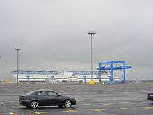 JadeWeserPort (German pronunciation: [jaːdə veːzɐ pɔɐ̯t]) is Germany's largest harbour project. It is supported by the states of Lower Saxony (50.1% stake) and Bremen (49.9% stake).[1] This new container port is located at Wilhelmshaven at the Jade Bight, a bay on the North Sea coast. It has a natural water depth in excess of 18 m. Container ships with a length of 430 m and 16,5 m draught will be able to call the JadeWeserPort at any tide. Construction work was begun in March 2008. The port was opened on 21 September 2012.[2] First, the port failed to attract any significant cargo volumes from container lines and it lay largely unused.[3] But the container handling could be raised from 60,000 in 2014 to 426,700 twenty-foot equivalent unit in 2015.[4] The yearly capacity of the port is 2,700,000 TEU.