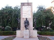 In 1912 Chicharro married Dolores Lamamié de Clairac Romero y Bermúdez de Castro (1890-1974),[10] sister of the Salamanca landowner and later a well-known Carlist politician, José María Lamamié de Clairac y de la Colina. As she inherited some 300 hectares[11] around Villarreal and Nules, the family moved to the spouse's La Salmantina estate, now located in the municipality of Les Alqueries (Castellón province).[12] The couple had 13 children,[13] born between 1914 and 1932. During early months of the Civil War the oldest daughter was tortured and killed by the Republican militia in Madrid.[14] Five sons volunteered to the Carlist Requeté;[15] one of them died in 1939 due to tortures suffered as the Republican POW.[16] Four sons joined División Azul; two of them died in combat in Russia, the two who survived grew to Francoist generals.[17] His second youngest son served as a diplomat and subgobernador in the Spanish Equatorial Guinea.[18] The youngest son became sort of celebrity as a wrestling champion in the 1950s.[19] Some of Jaime's grandchildren became public figures and stirred political controversy as late as in 2013.[20]