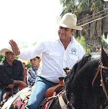 Jaime Heliodoro Rodríguez Calderón (born 28 December 1957 in Galeana, Nuevo León), sometimes referred to by his nickname El Bronco, is the Governor of the northern state of Nuevo León. He is the first independent candidate to have won a governorship in Mexico.[1] He served as mayor of García, Nuevo León (2009–2012) as a member of the Institutional Revolutionary Party (PRI), and was best known for his hard-line stance against organized crime. Rodríguez won the 2015 race for Governor as an independent candidate on June 7, 2015, winning half the votes of the election compared to his traditional party competitors, who split the remainder of the votes.[2] He will serve as governor until 2021.