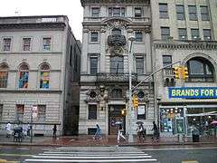 The Jamaica Savings Bank building, located in the Jamaica section of the borough of Queens in New York City, was built between 1897 and 1898 in the Beaux-Arts style. It is a slender four story brick building with a limestone facade. It features a deeply rusticated ground floor with windows protected by elegant metal grilles. The facade is framed by double-story pilasters and covered with elaborate carved brackets, swags and other elements.[2]