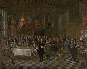 Van Meunincxhove painted two remarkable paintings documenting events which occurred during the residence in Bruges of Charles II of England and his brothers Henry Stuart, Duke of Gloucester and James Stuart, Duke of York in the period from 22 April 1656 to 15 March 1659. On 2 October 1656 the King and his brothers visited the Bruges Guild of the ‘Kolveniers’ (Guild of Harquebusiers) where the Duke of York successfully shot the target (a parrot). This was cause for great celebration among the local population and was immediately recorded in a poem by Ingelbrecht Cockuyt of the Bruges Chamber of Rhetoric. Van Meunincxhove remembered the same event about 15 years later in two works that were destined for the new premises of the Guild of the Kolveniers (both now in the Groeningemuseum). One of the compositions depicts the celebration meal and the other the King and his retinue in the ‘Hoveningen’, the walled garden of the Guild. In the second picture depicting the Hoveningen, van Meunincxhove follows the style of genre paintings developed in Flanders after 1660 by artists such as Gillis van Tilborch: he depicts the two groups of three persons on the left foreground on a small scale while the persons surrounding the King have an abnormally long leg which serves to pull the viewer into the depth of the composition. The fabric of the clothing is rendered in rich detail while the artist also depicts some anecdotic details such as the children who climb the wall to better view the event. The second painting depicting the celebration meal includes a representation of the painting of the Hoveningen.[6]
