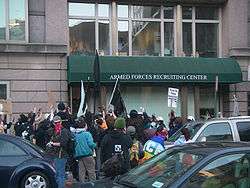In the late afternoon, approximately 30 demonstrators marched to the Armed Forces Recruiting Center at 14th street. The window at the recruitment center was smashed,[5]and the demonstrators dispersed soon after.