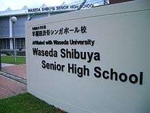 The Japanese School Singapore serves elementary and junior high students and the Waseda Shibuya Senior High School in Singapore (formerly Shibuya Makuhari Singapore School) serves high school students.