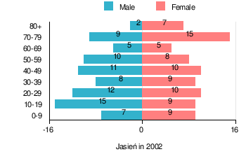 According to the 2002 Poland census, there were 161 people residing in Jasień village, of whom 49.1% were male and 50.9% were female. In the village, the population was spread out with 23% under the age of 18, 30.4% from 18 to 44, 21.7% from 45 to 64, and 24.8% who were 65 years of age or older.[1]