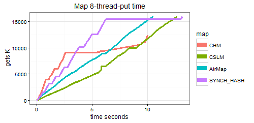 The diagram indicates how synchronizing using Collections.synchronizedMap() wrapping a regular HashMap (purple) may not scale as well as ConcurrentHashMap (red). The others are the ordered ConcurrentNavigableMaps AirConcurrentMap (blue) and ConcurrentSkipListMap (CSLM green). (The flat spots may be rehashes producing tables that are bigger than the Nursery, and ConcurrentHashMap takes more space. Note y axis should say 'puts K'. System is 8-core i7 2.5 GHz, with -Xms5000m to prevent GC). GC and JVM process expansion change the curves considerably, and some internal Lock-Free techniques generate garbage on contention.