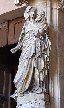 Jean de Marville created an important school of sculpture. Claus Sluter was the most noted member.[3] Sluter's nephew Claus de Werve was another member of this school.[4] Lesser sculptors of this school were Jehan de la Huerta and Antoine le Moiturier.[5] Claus Sluter (c. 1360 - 1405), a sculptor from Harlem in the Netherlands, joined Jean de Marville's studio in 1383. At that time de Marville was directing the construction and decoration of the Chartreuse of Champanol, which was to be the Duke's burial place.[6] The image of the virgin and child in the center pillar of the monastery's chapel is attributed to either Marville or Sluter.