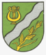 The German blazon reads: In Grün ein silberner Schräglinkswellenbalken, oben rechts eine goldene Lyra, unten links ein goldenes Ährenbüschel (Wiesenlolch)