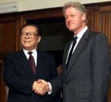 Jiang went on a groundbreaking state visit to the United States in 1997, drawing various crowds in protest from the Tibet Independence Movement to supporters of the Chinese democracy movement. He made a speech at Harvard University, part of it in passable English, but could not escape questions on democracy and freedom. In the official summit meeting with US President Bill Clinton, the tone was relaxed as Jiang and Clinton sought common ground while largely ignoring areas of disagreement. Clinton would visit China in June 1998, and vowed that China and the United States were partners in the world, and not adversaries. When American-led NATO bombed the Chinese Embassy in Belgrade in 1999, Jiang seemed to have put up a harsh stance for show at home, but in reality only performed symbolic gestures of protest, and no solid action.[17] Jiang's foreign policy was for the most part passive and non-confrontational. A personal friend of former Canadian Prime Minister Jean Chrétien,[38] Jiang strengthened China's economic stature abroad, attempting to establish cordial relations with countries whose trade is largely confined to the American economic sphere. Despite this, there were at least three serious flare-ups between China and the US during Jiang's tenure. The first was in 1996 when President Clinton dispatched warships to the Taiwan area during a period when the PLA appeared to be making threatening gestures. The second was the above-mentioned NATO bombing of Serbia and the third was the shootdown of a US spyplane over Hainan in April 2001.