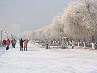 Jilin City is a popular destination for tourists to come each winter to view the magnificent rime ice (雾凇/霧凇) on trees along the banks of the Songhua River, (the river is the only river in the region that does not freeze in winter). The rime ice is a natural phenomenon that occurs every year during January and February. It is a result of when water vapor rises up from the warm Songhua River to meet the cold −20 °C (−4 °F) night air, causing the crystallisation of water vapour on willows branches.