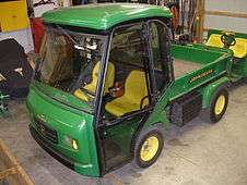 The John Deere Gator is a family of small all-terrain utility vehicles produced by the John Deere Corporation. They typically feature a box bed, similar in function to a pickup truck. The bed can also be installed as an electric dump body. The John Deere Gator has been made in a variety of configurations, ranging from 4 to 6 wheels.[1] The Gator line of vehicles are designed to serve on farms, worksites, and ranches, rather than as a pure off-road vehicle. However it is possible to order with specific off road features. In 1992, the vehicle replaced the three or five wheel John Deere AMT, introduced in 1987.[2]