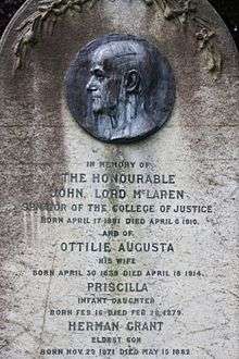 Lord McLaren lived and died in Edinburgh and is buried in the Grange Cemetery on its southmost path.
