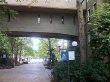 The building includes two medieval tower-like buildings that are joined by an arched walkway, and the pronounced corners of the building’s towers suggest a fortress city. The fifth-floor Common Room, which bridges the two towers, provides excellent views of the City and the University.[2] The two six storey towers are named ‘East Tower’ and ‘West Tower’, and are capped by the sixth story’s projected eaves. The windows of the lower levels are fitted with rounded framed, aluminum sash windows, whereas the equidistant windows of each tower’s upper level appear castellated. Some windows of the towers are fitted with hooded shades.