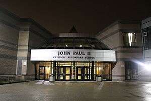 John Paul II Catholic Secondary School, often referred to as JPII, John Paul, or Jp; is a secondary school in London, Ontario. It is administered by the London District Catholic School Board. It is located at 1300 Oxford Street East, at the northeast corner of Oxford and Highbury Avenue, next to Fanshawe College. The property is quite large and occupies the corner of Oxford and Fanshawe.