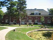 Around the windmill area, while not precisely an outbuilding, is a pond.[3] The grounds remain mostly unchanged, allowing visitors to stroll the area and view the restored windmill and the brick barn that was used as a gymnasium after 1930.[3] The 50 by 80 ft (15 by 24 m) building was built as a carriage house by Oughton in 1896, and used to house horses and cattle.[3][6] From 1930 to 1965 the building was used as a recreation facility for the patients at the Keeley Institute.[3] In 1989 the Oughton family donated the structure to the Prairie Creek Library District and it has since become the home of the Prairie Creek Public Library.[6]