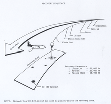 During the early months of the SAMOS program it was essential not only to hide the Corona and GAMBIT technical efforts under a screen of SAMOS activity, but also to make the orbital vehicle portions of the two systems resemble one another in outward appearance. Thus, some of the configuration details of SAMOS were decided less by engineering logic than by the need to camouflage GAMBIT and thus, in theory, a GAMBIT could be launched without alerting many people to its real nature. Problems relative to tracking networks, communications, and recovery were resolved with the decision in late February 1961 to use Johnston Island as the film capsule descent and recovery zone for the program.[37] On July 10, 1961 work was initiated on four buildings of the Johnston Island Recovery Operations Center for the National Reconnaissance Office. Men from the Johnston Atoll facility would recover the parachuting film canister capsules with a radar equipped JC-130 aircraft by capturing them in the air with a specialized recovery apparatus.[38] The recovery center was also responsible for collecting the radioactive scientific data pods dropped from missiles following launch and nuclear detonation.[39]
