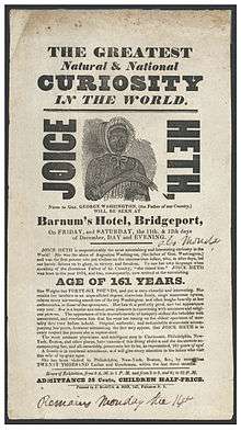 Little is known of Heth's early years. In 1835 she was held as a slave by John S. Bowling and exhibited in Louisville, Kentucky.[2] In June 1835, she was sold to promoters R.W. Lindsay and Coley Bartram.[2] Lindsay introduced her as having been the childhood nurse of George Washington, but, lacking success, he sold her in her old age to PT Barnum.[2][3] Posters advertising her shows in 1835 included the lines, "Joice Heth is unquestionably the most astonishing and interesting curiosity in the World! She was the slave of Augustine Washington, (the father Gen. Washington) and was the first person who put clothes on the unconscious infant, who, in after days, led our heroic fathers on to glory, to victory, and freedom. To use her own language when speaking of the illustrious Father of this Country, 'she raised him'. Joice Heth was born in the year 1674, and has, consequently, now arrived at the astonishing age of 161 years".[4]