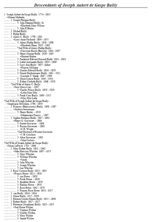 Joseph married Marie Lefevre de La Vigne (Mo-nee or Tou-se-qua) in 1810. She was born in 1783 in Ma-con, a large mixed-band Indian village on the Raisin River west of present Monroe, Michigan. Her mother was a Potawatomi of the St. Joseph Band (now known as the Pokagon Band of Potawatomi Indians). Marie married Kougowma (or Kiogima), also called La Vigne, a medicine man in the Mackinac band of Ottawa, who took her to Mackinac Island. Kougowma died between 1804 and 1809. Bailly adopted the two daughters from this marriage, Agatha born in 1797 and Therese, born in 1803. Five more children were born of this second marriage, who were Esther in 1811, Rose in 1813, Eleanor in 1815, Robert in 1817 and Hortense in 1819.[2]