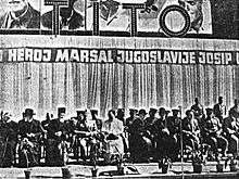On 21 December 1941, the Partisans created the First Proletarian Brigade (commanded by Koča Popović) and on 1 March 1942, Tito created the Second Proletarian Brigade.[97] In liberated territories, the Partisans organised People's Committees to act as civilian government. The Anti-Fascist Council of National Liberation of Yugoslavia (AVNOJ) convened in Bihać on 26–27 November 1942 and in Jajce on 29 November 1943.[98] In the two sessions, the resistance representatives established the basis for post-war organisation of the country, deciding on a federation of the Yugoslav nations. In Jajce, a 67-member "presidency" was elected and established a nine-member National Committee of Liberation (five communist members) as a de facto provisional government.[99] Tito was named President of the National Committee of Liberation.[100]