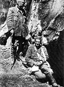 Soon after the outbreak of World War I in 1914, the 25th Croatian Home Guard Regiment marched towards the Serbian border, but Broz was arrested for sedition and imprisoned in the Petrovaradin fortress in present-day Novi Sad.[38] Broz later gave conflicting accounts of this arrest, telling one biographer that he had threatened to desert to the Russians, but also claiming that the whole matter arose from a clerical error.[35] A third version was that he had been overheard saying that he hoped the Austro-Hungarian Empire would be defeated. After his acquittal and release,[39] his regiment served briefly on the Serbian Front before being deployed to the Eastern Front in Galicia in early 1915 to fight against Russia.[35] On one occasion, the scout platoon he commanded went behind the enemy lines and captured 80 Russian soldiers, bringing them back to their own lines alive. In 1980 it was discovered that he had been recommended for an award for gallantry and initiative in reconnaissance and capturing prisoners.[40] On 25 March 1915,[lower-alpha 7] he was seriously wounded and captured during a Russian attack near Bukovina.[41] Now a prisoner of war (POW), Broz was transported east to a hospital established in an old monastery in the town of Sviyazhsk on the Volga river near Kazan.[35] During his 13 months in hospital he had bouts of pneumonia and typhus, and learned Russian with the help of two schoolgirls who brought him Russian classics by such authors as Tolstoy and Turgenev to read.[35][40][42]
