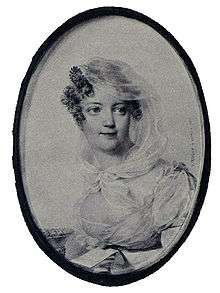 Juliana de Almeida e Oyenhausen, also known as Julia Stroganova, (1782 - 1864), was a Portuguese noble and lady in waiting. Born to Leonor de Almeida Portugal, 4th Marquise of Alorna and Carlos Pedro Maria José Augustus, Count of Oyenhausen-Groewenbourg, she was the official mistress of Jean-Andoche Junot, the regent of French-occupied Portugal in 1807-1808, and exerted political influence during her position as such.